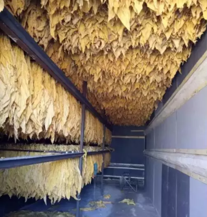 另一种是土壤比较肥沃,但因天气长期干旱而逼熟的烟叶。这类叶片未真正成熟,叶片厚,含水量小,烘烤时烟叶内的水分难以汽化排出,不易失水发软,也不易变黄。烘烤时,这一类烟叶要装密些,天窗和地洞要严格密封,并采取加湿措施。在变黄初期采用36℃以下的温度,保持较高的相对湿度。升温要缓慢进行,使烟叶在42℃以前充分变黄后再升温和少量排湿。45—46℃要延长时间。进入定色期时,升温要慢,如升温过急,烟叶易变褐;变黄程度要高一些。待整个烤房内烟叶都钩尖卷边后,即可按一般方法进行下一阶段的烘烤。