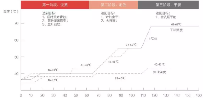 干旱气候条件下生长的烟叶有以下两种情况: 一种是土壤肥力差,特别是氮素含量低,在天气干旱条件下烟叶的叶龄不够,叶含水量少,叶小而薄,往往早熟。烘烤这种烟叶变黄期温度要求高些,升温速度可快一些,以免烟叶变成全黄,因为全黄易出白黄烟。由于烟叶含水量低,要采取加湿措施。转火定色程度不能太高,一般当烟叶变黄到5—6成时温度即可达到45℃,即转入定色期。定色期升温宜慢,使未完成变黄的烟叶继续变黄。
